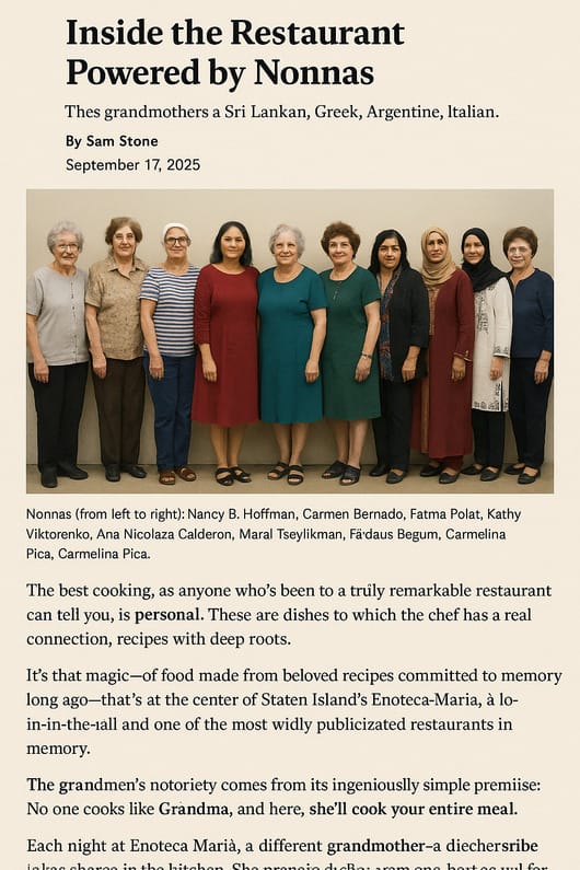 EDITOR’S NOTE - Forgive me for putting up an article about a Staten Island Restaurant few of us may ever visit. BUT isn’t this an amazing idea?! I would love to see it brought to life here, wouldn’t you? Some of the best eating I’ve ever experienced was created by a Grandma.
