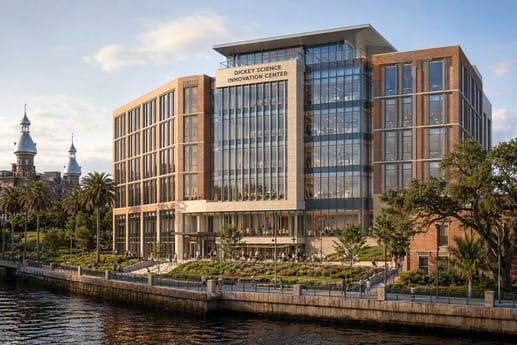 Set along the Hillsborough River, the 153,000-square-foot facility will feature 25 teaching labs and 23 research labs, supporting programs like forensic science, chemistry, and microbiology. The building will centralize science education, replacing classes currently spread across eight campus locations.